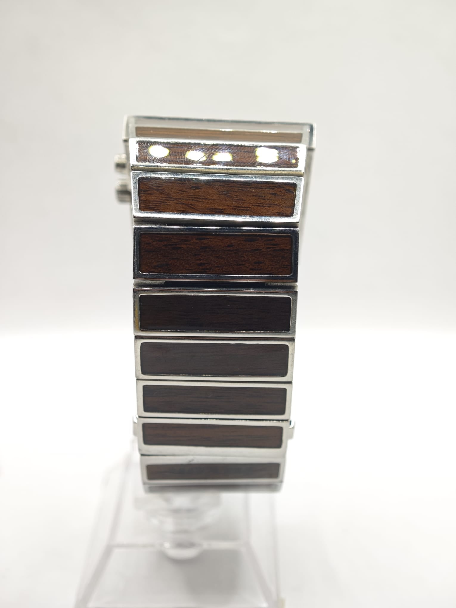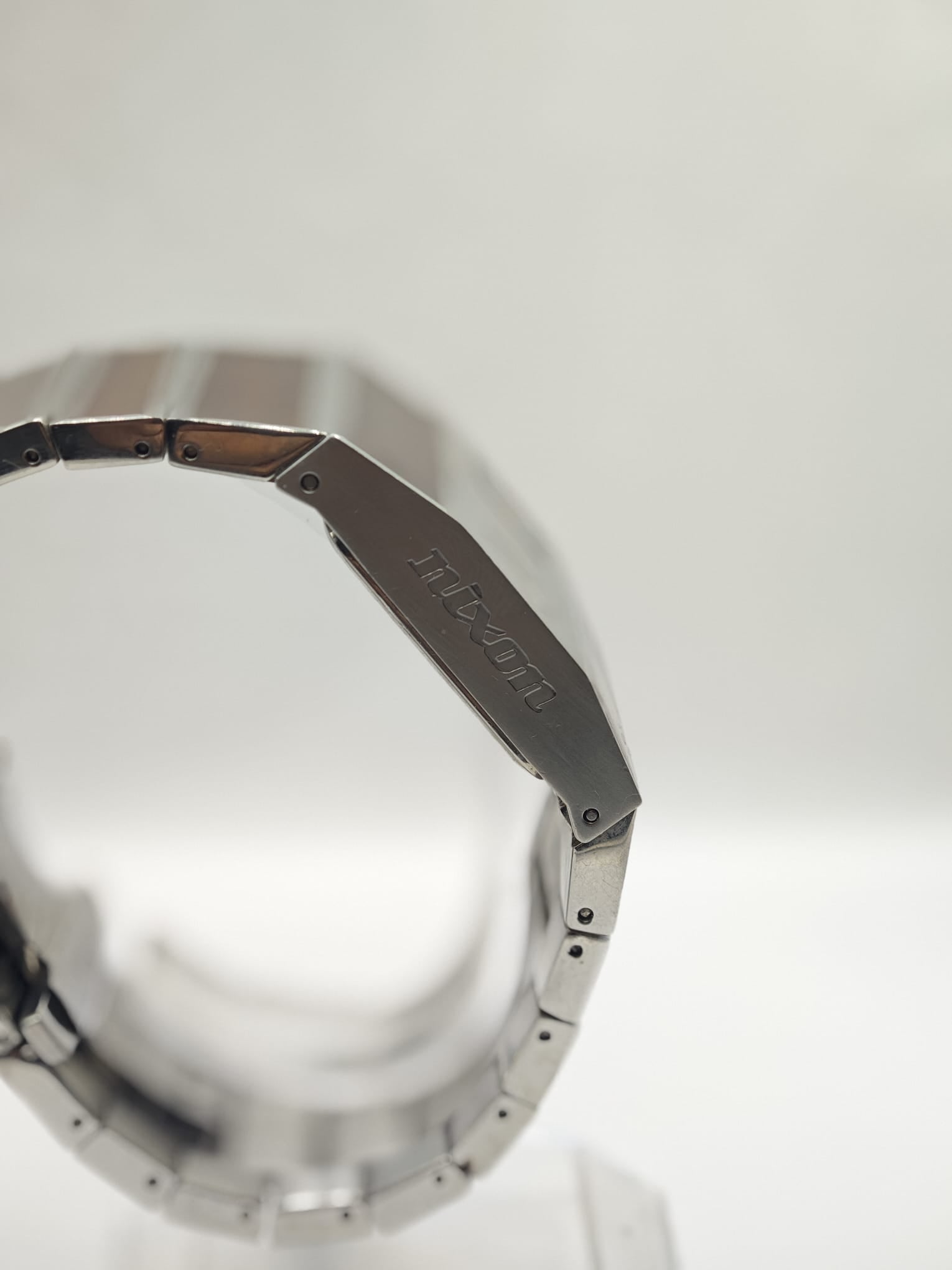 Ceas vintage Nixon Rotolog, brand american cunoscut pentru design inovator și construcție solidă. Model unic cu afișaj tip "jump hour" (rotolog), combinație de oțel și lemn, și iluminare la apăsare. Funcțional și verificat.